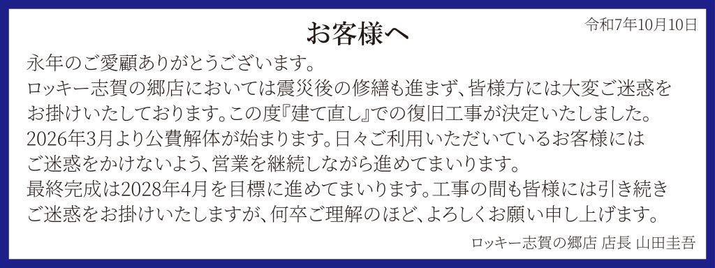 お探しの店舗をクリック!!→ [ 志賀の郷店 | 七尾店 | 羽咋店 | 富来店 | 中能登店 |食文化新鮮館 ]